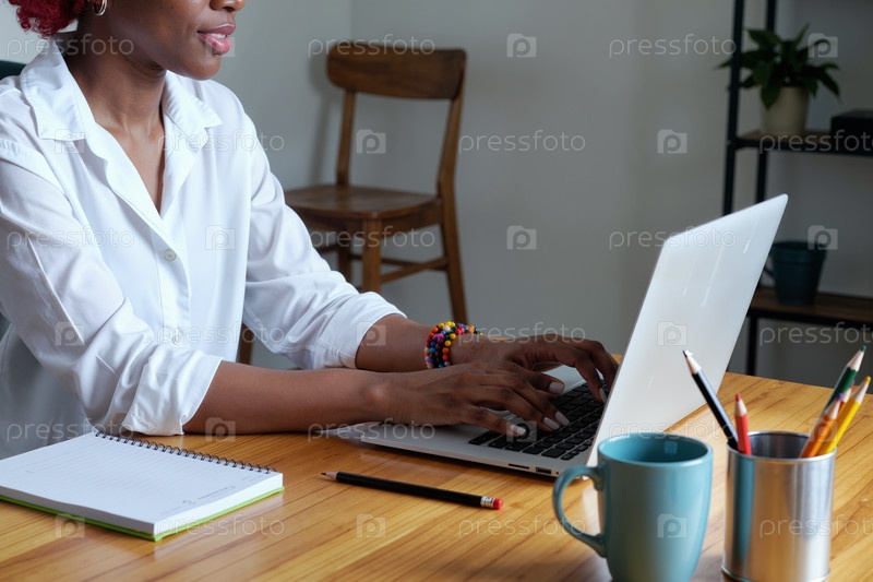 Молодая взрослая чернокожая женщина работает удаленно на ноутбуке в домашнем офисе