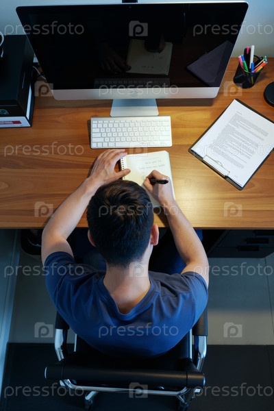 Молодой взрослый азиатский мужчина с инвалидностью пишет записки за столом в офисной обстановке