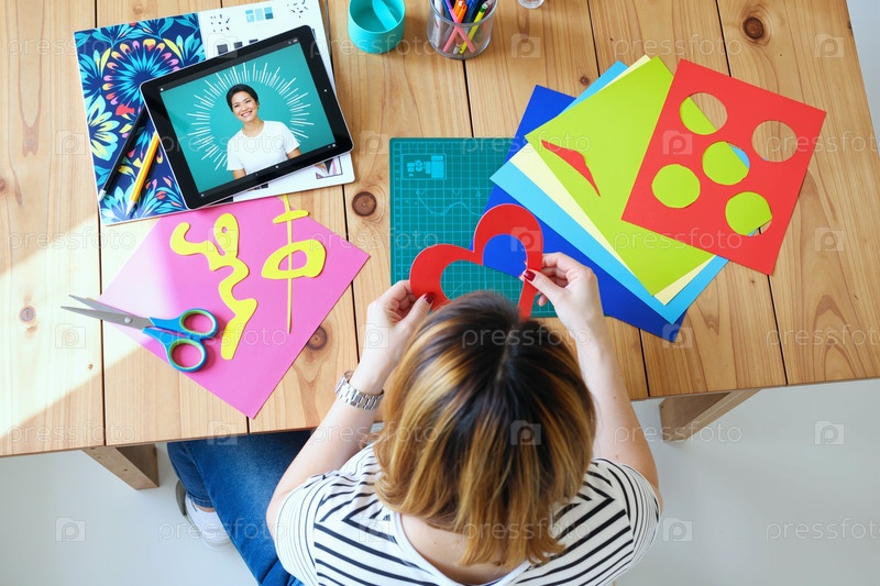 Молодая белая женщина создает бумажные ремесла во время просмотра онлайн-урока