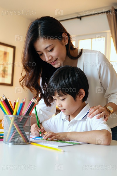 Молодая азиатская мать направляет ребенка рисовать цветными карандашами в помещении