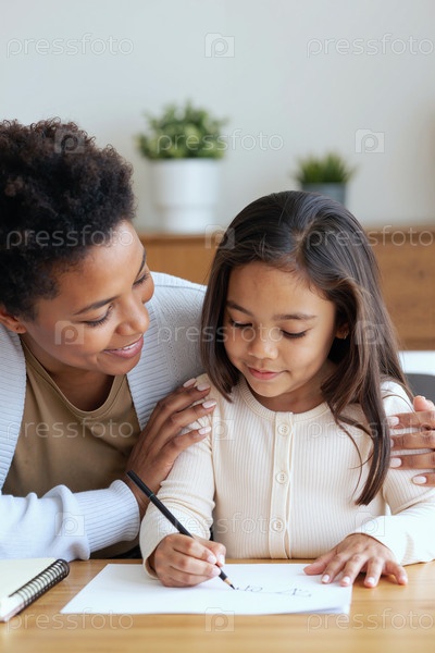 Черная взрослая женщина направляет ребенка Молодая девочка рисует вместе в помещении
