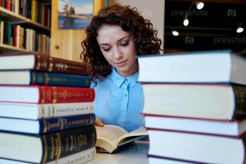 Молодая взрослая кавказская женщина читает книгу в окружении заложенных книг внутри