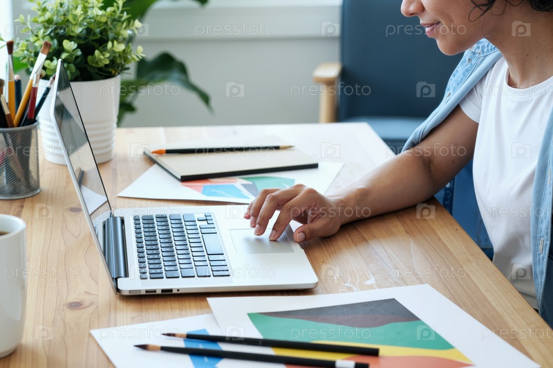 Молодая взрослая белая женщина использует ноутбук во время работы над творческим проектом