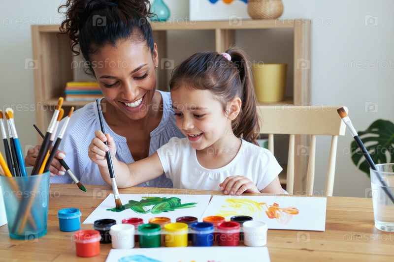 Улыбающаяся молодая белая женщина помогает ребенку-девочке рисовать за столом в помещении