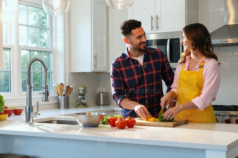 Молодой белый мужчина и женщина готовят свежие овощи вместе на кухне