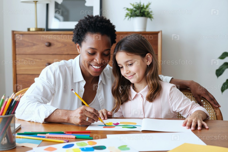 Улыбающаяся чернокожая женщина преподает рисунок белому ребенку за столом в помещении