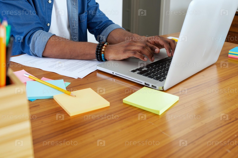 Молодой взрослый чернокожий мужчина печатает на ноутбуке, работая за рабочим столом
