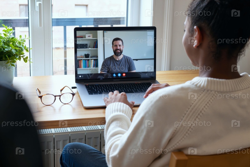 Молодой взрослый белый мужчина улыбается во время видеозвонка с молодой взрослой женщиной