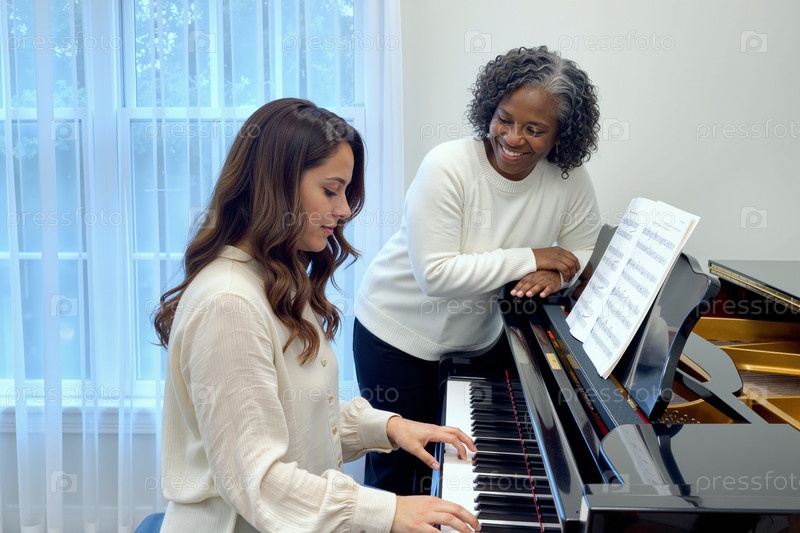 Американка средних лет учит молодого взрослого белокожей женщине играть на фортепиано