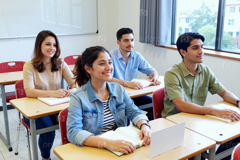 Группа молодых взрослых многонациональных студентов, посещающих лекции в классе