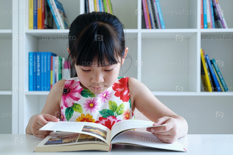 Азиатская девочка читает книгу за столом в библиотеке, сосредоточившись на обучении