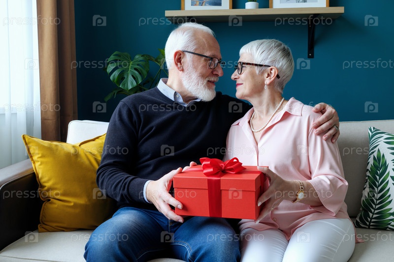 Старшая пара сидит вместе, держа подарочную коробку и улыбается