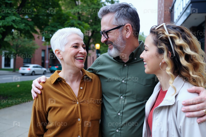 Пара средних лет улыбается молодой взрослой женщине на открытом воздухе