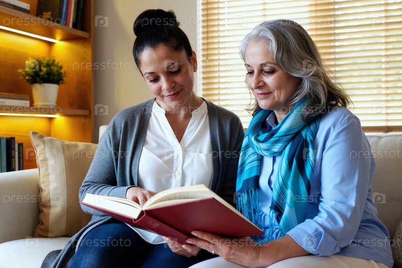 Женщина среднего возраста и молодая взрослая женщина читают книги вместе