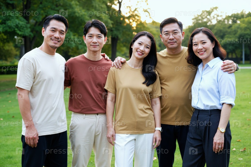 Группа мужчин и женщин среднего возраста из Азии, улыбающихся вместе на открытом воздухе