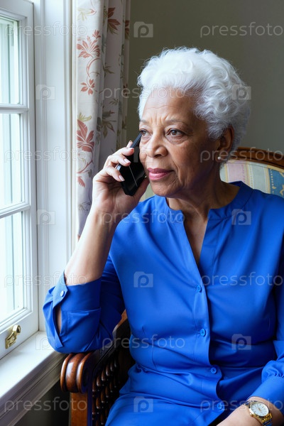 Чёрная женщина разговаривает со смартфоном, сидя возле окна