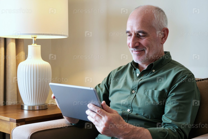 Мужчина средних лет сидит в помещении с помощью цифрового планшета и улыбается