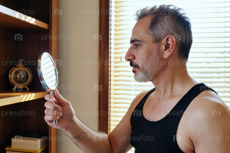 Мужчина средних лет, осматривающий лицо в зеркале В помещении днем