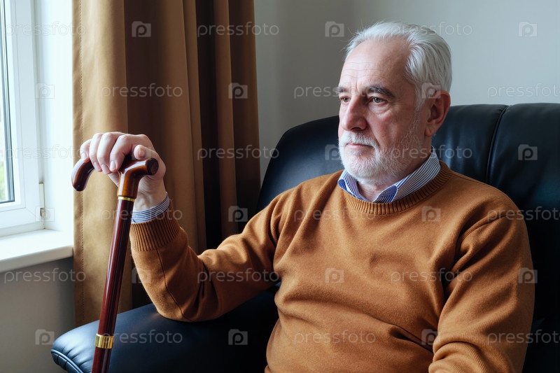 Старший мужчина сидит в помещении, держит трость и смотрит в окно