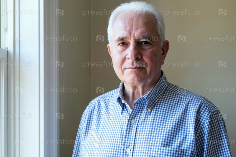 Портрет пожилого человека, стоящего возле окна и смотрящего на камеру