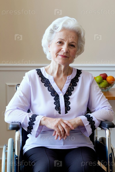 Портрет пожилой женщины, сидящей в инвалидном кресле и улыбающейся внутри