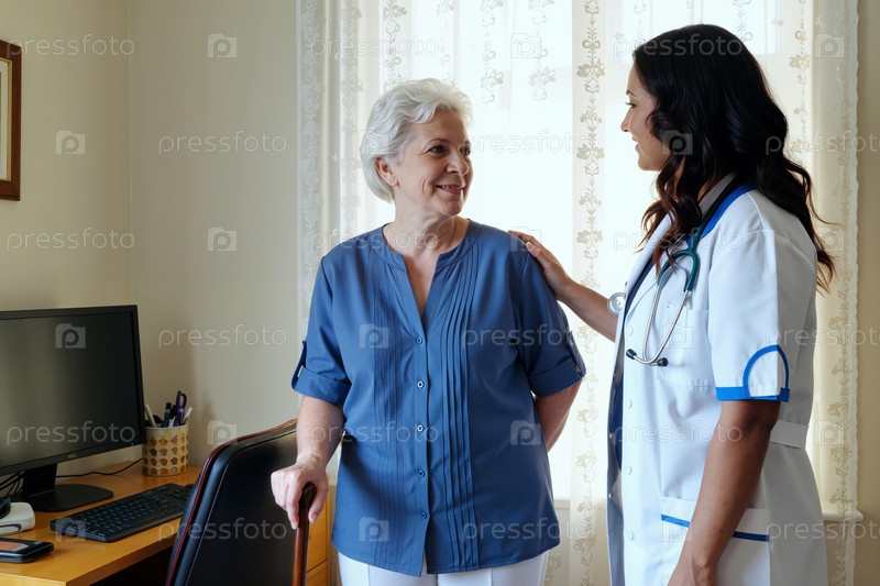 Старшая женщина улыбается, разговаривая с молодой взрослой женщиной-врачом