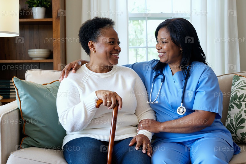 Старшая чернокожая женщина сидит с медсестрой, улыбается и обнимает ее в помещении