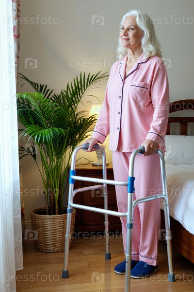 Старшая женщина стоит с Уолкером, улыбаясь возле окна спальни