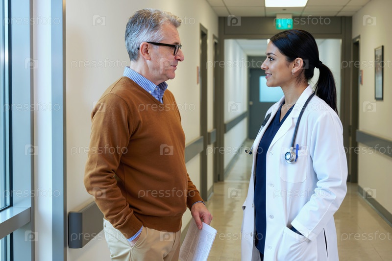 Мужчина среднего возраста консультирует женщину-врача в коридоре больницы