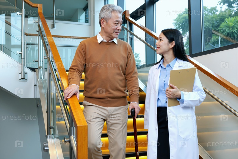 Азиатский мужчина ходит с тростью в сопровождении молодой взрослой азиатской женщины