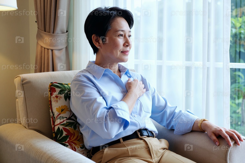 Азиатская женщина средних лет сидит в помещении, улыбается и кладет руку на грудь