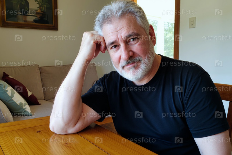 Портрет пожилого человека, улыбающегося, сидящего за деревянным столом в помещении