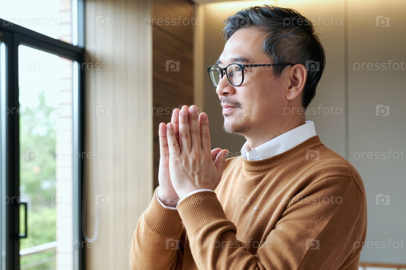 Азиат среднего возраста, практикующий осознанность в помещении возле окна