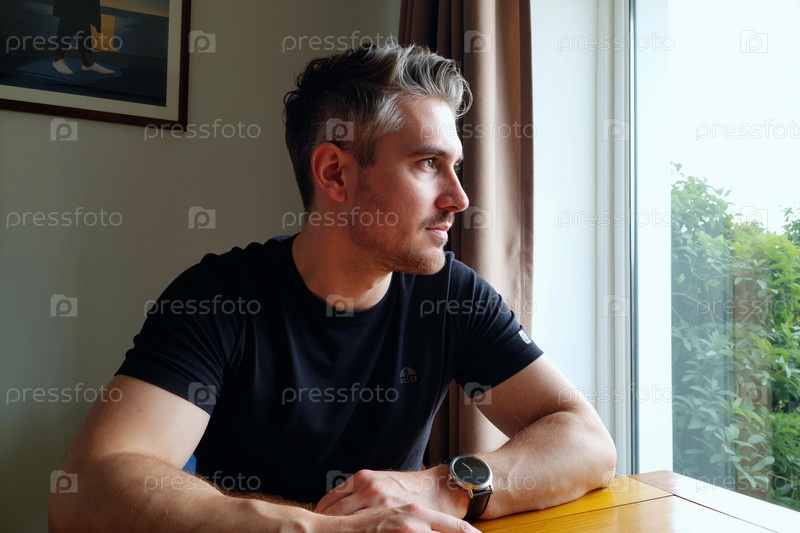 Молодой взрослый мужчина сидит в помещении и задумчиво смотрит из окна