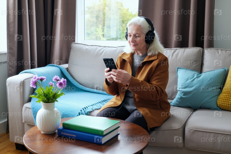 Пожилая женщина слушает музыку на смартфоне, сидя в помещении