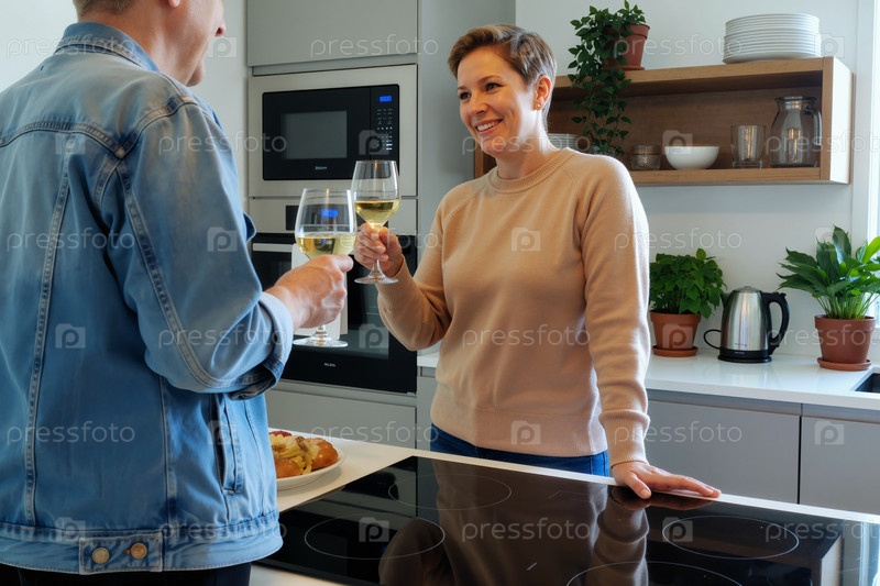 Молодая женщина тостирует бокал вина с мужчиной на кухне
