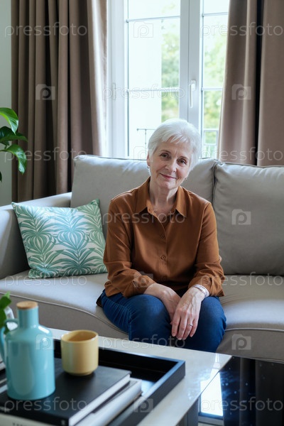 Портрет пожилой женщины, сидящей на диване и улыбающейся в камеру
