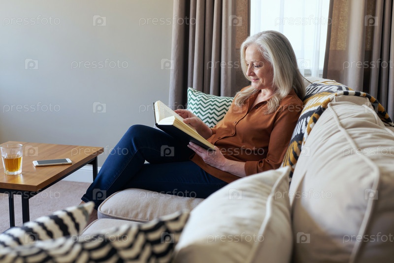 Пожилая женщина отдыхает на диване Читать книгу в гостиной