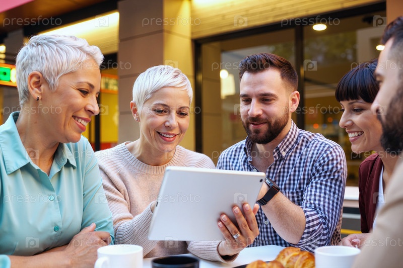 Группа взрослых женщин и мужчин, использующих цифровые планшеты на открытом воздухе