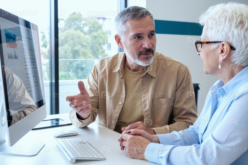 Взрослый мужчина объясняет бизнес-данные старшей женщине
