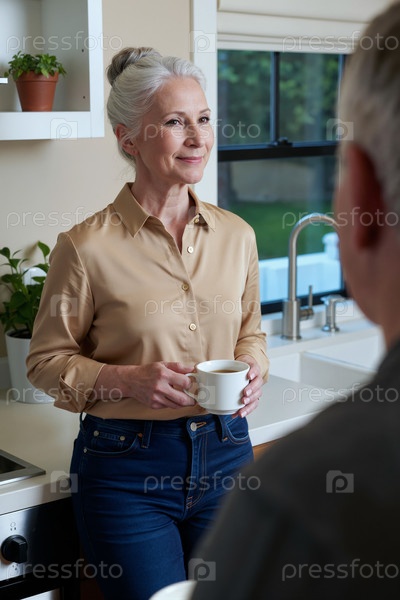 Старшая женщина улыбается, держа чашку кофе на кухне