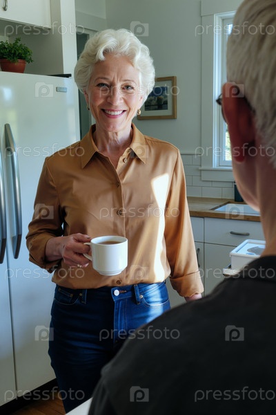 Портрет пожилой женщины, улыбающейся в то время как она держит чашку кофе внутри