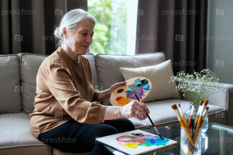 Старшая женщина рисует произведения искусства, сидя в помещении на диване