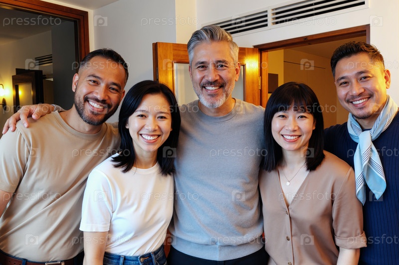 Группа взрослых и молодых азиатов и друзей, улыбающихся в помещении