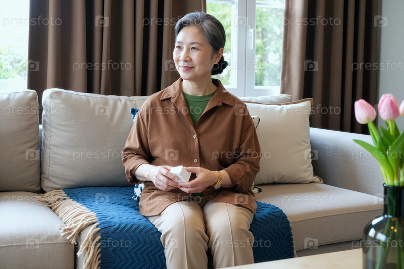 Старшая азиатская женщина сидит на диване, улыбается и держит маленькую коробку