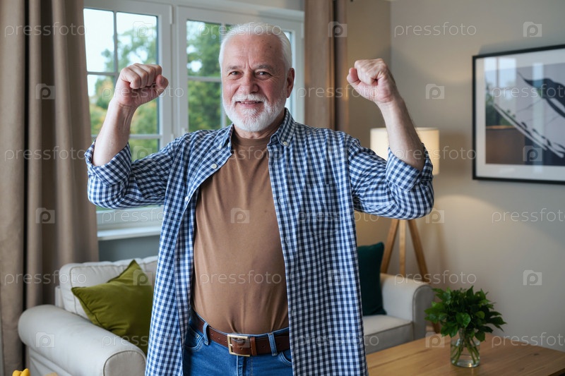 Старший мужчина улыбается и поднимает руки в жесте победы в помещении