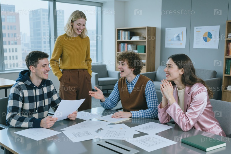 Группа молодых коллег, сотрудничающих во время офисной встречи