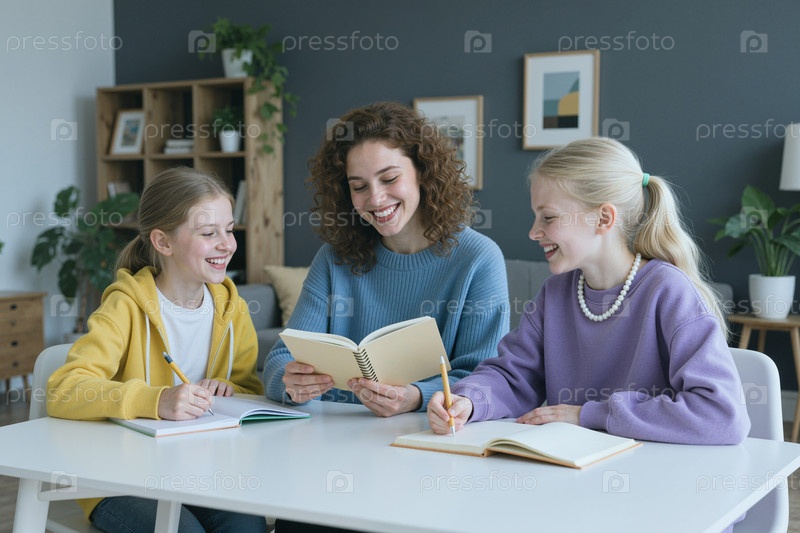 Молодая женщина учит двух девочек, которые учатся вместе в помещении