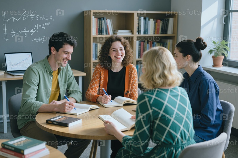 Группа молодых и многонациональных студентов, сотрудничающих в библиотеке