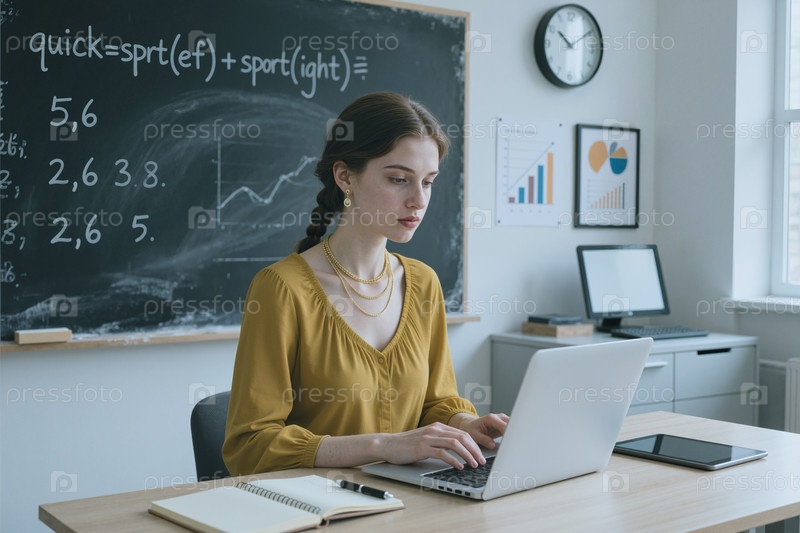 Молодая женщина работает на ноутбуке в условиях современного класса